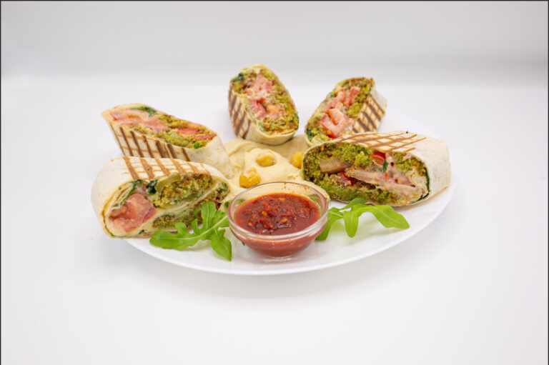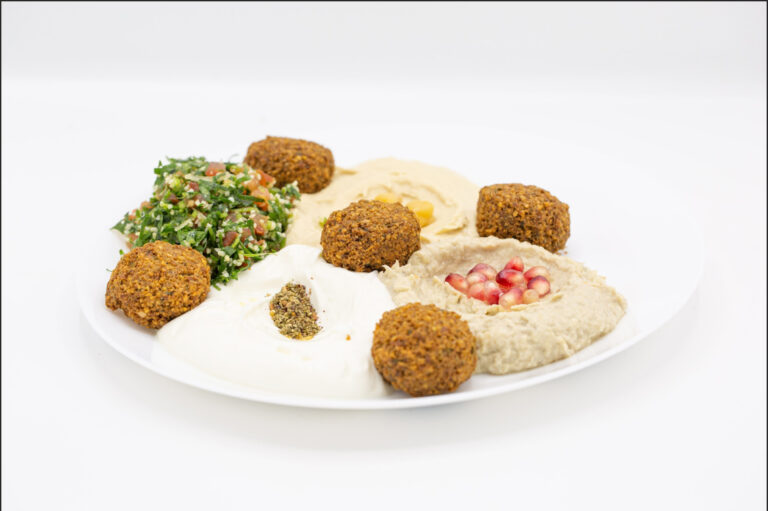 Falafel, houmous, tomates, roquette, menthe, cornichons et tahina (sauce de sésame)